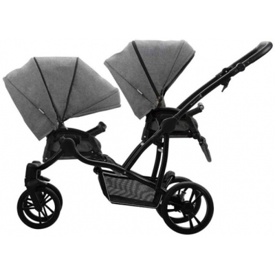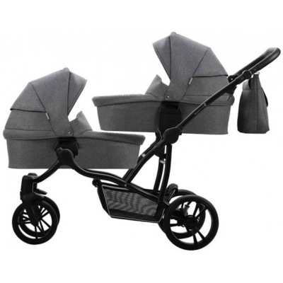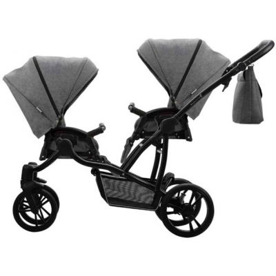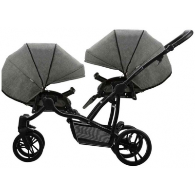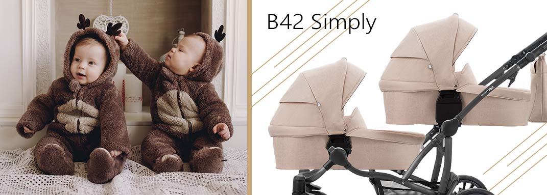 Оббивка коляски виконана з водовідштовхувальної тканини з високим захистом від сонячного ультрафіолетового випромінювання. Красиво підібрані кольори оббивки й екошкіряні деталі забезпечують сучасний зовнішній вигляд. Положення колисок в колясці спроектовано таким чином, що вони частково перекриваються, що робить цю двомісну модель більш компактною порівняно з іншими колясками для двійні. Коляску Bebetto B 42 Simply напевно оцінять батьки, які віддають перевагу мобільність.