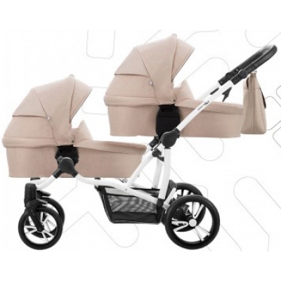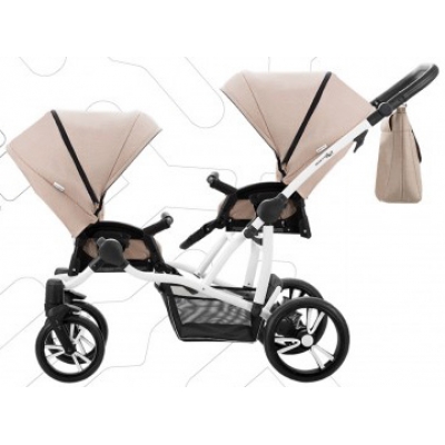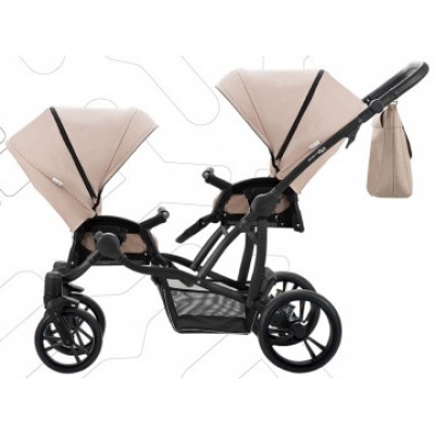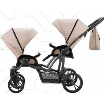 Оббивка коляски виконана з водовідштовхувальної тканини з високим захистом від сонячного ультрафіолетового випромінювання. Красиво підібрані кольори оббивки й екошкіряні деталі забезпечують сучасний зовнішній вигляд. Положення колисок в колясці спроектовано таким чином, що вони частково перекриваються, що робить цю двомісну модель більш компактною порівняно з іншими колясками для двійні. Коляску Bebetto B 42 Simply напевно оцінять батьки, які віддають перевагу мобільність.