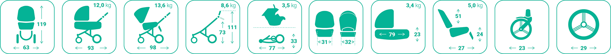 Коляска Pascal зі встановленою колискою призначена для дитини до досягнення віку в 6 місяців. Колиска важить всього 3,4 кг, що є дуже низьким показником серед аналогічних моделей.
