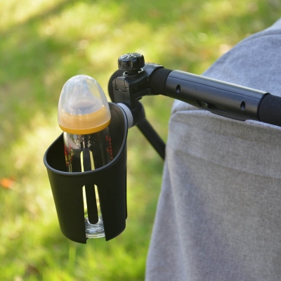 Універсальний тримач для пляшечок до дитячої коляски. Підходить для всіх візків. Його можна встановити на закруглений профіль ручки керування візком, на бампер сидіння прогулянкової коляски, на руль велосипеда, тощо.