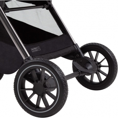 - Амортизація на всіх колесах: надає плавний рух, незалежно від типу покриття, роблячи прогулянки м’якими та комфортними. Передні поворотні колеса з функцією фіксації додають маневреності.