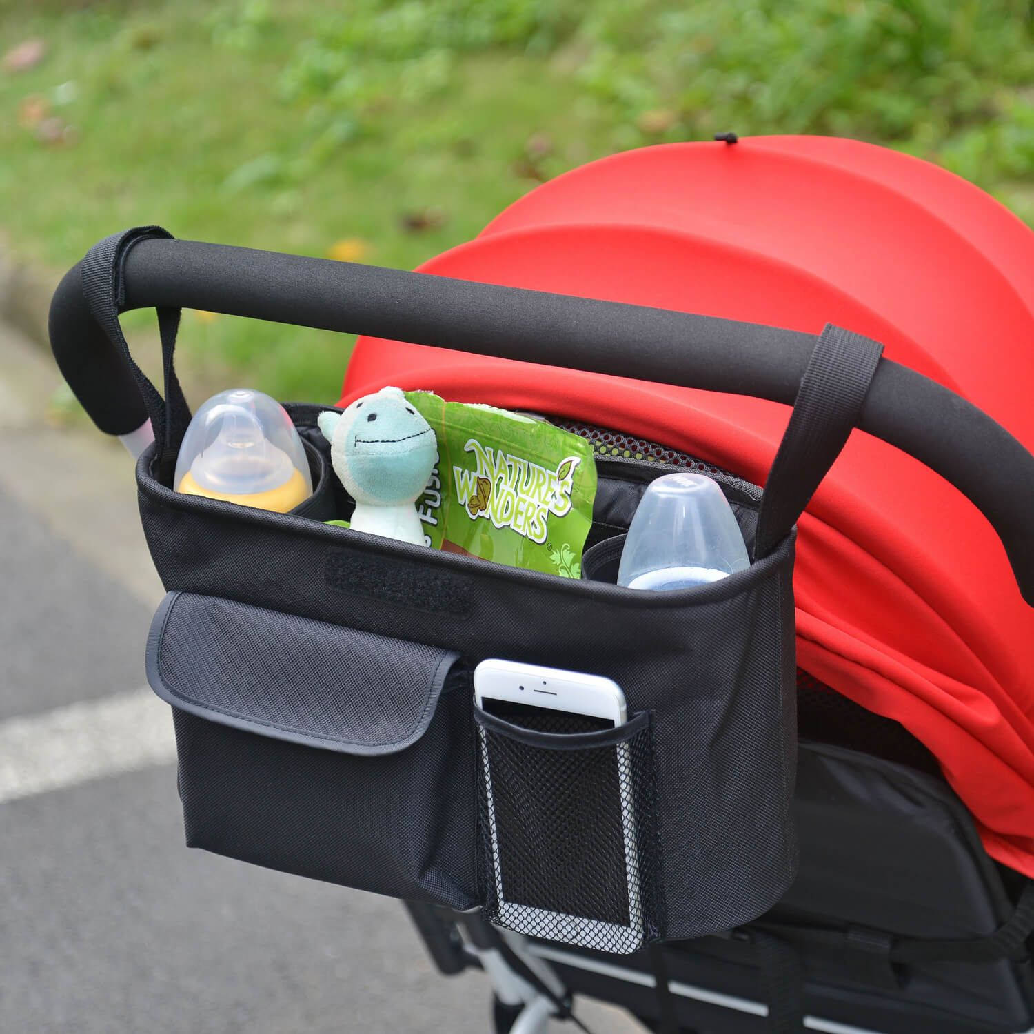 З органайзером для коляски Bugs у вас завжди будуть під рукою необхідні дрібні предмети, коли ви гуляєте з дитиною. В тому числі дитяча їжа з напоями, іграшки, підгузки, телефон, тощо. Більше їх не доведеться шукати в глибині сумки чи кошика під сидінням!
